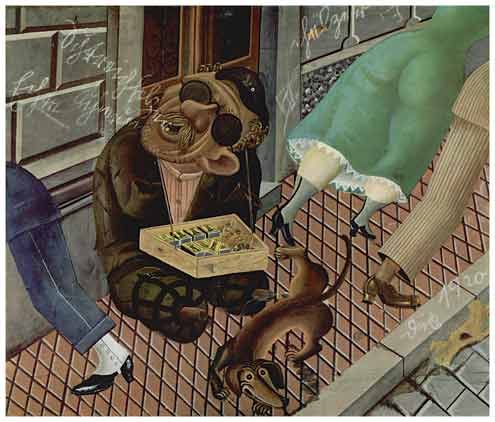 Das Bild von Otto Dix ist eine Anklage an die Verhältnisse. Die Nachkriegssituation mit ihren brutalen Ungerechtigkeiten wird angeklagt. Kriegskrüppel und "feine Bürger" werden miteinander konfrontiert, sogar der Hund pisst den Bettler an. Dies ist typisch für eine O'''''-Aussage, die kulturellen Zusammenhänge werden entlarvt, werden gebrandmarkt, werden schonungslos aufgezeigt. |