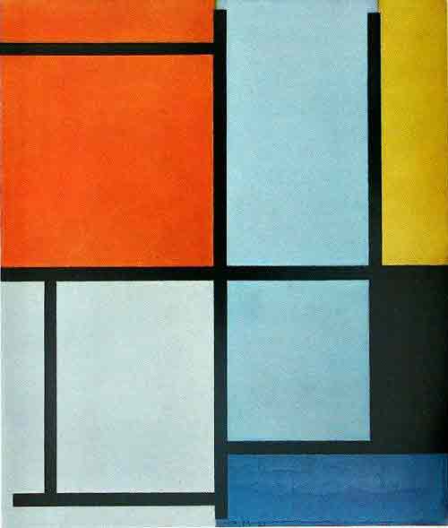 Mondrian ist ein Künstler der holländischen Künstlergruppe De Stijl, die in den 20er Jahren des letzten Jhdts. die Idee der Abstrakten Kunst weiterentwickelt hat. Konstruktivisten und Suprematisten hatten eine revolutionäre, gesellschaftliche Perspektive in ihrer Arbeitsweise, sie negierten die reale Welt als Gegenstand der Darstellung und überführten Raum und Zeit in abstrakte Zeichen „suprematistischer” Art. Die Künstler der Gruppe De Stijl und besonders Piet Mondrian entwickelten auf dieser Grundlage eine "reine Abstraktion", deren Ziel es war, ein Gesamtkonzept zu schaffen, bei dem abstrakt-geometrische Formen und farbliche Klarheit im Vordergrund stehen sollten. Senkrechte