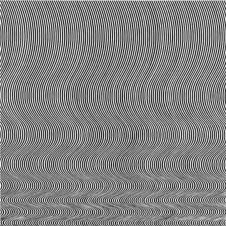 Flimmern und Vibrieren lässt der Netzhaut keine Ruhe. Die Retina wird zum Sehen "gezwungen" . Die Oberfläche des Bildes scheint sich zu heben und zu senken, Schwindelgefühle stellen sich ein. Das Auge findet keinen Fokus, auf den es sich konzentrieren könnte. Die Wahrnehmungspsychologie erklärt dies damit, dass das Bild nur aus einem einzigen Element: aus einer wellenförmigen Linie besteht, die im Positiv-Negativ-Prinzip etwa 120 mal wiederholt wird und somit eine serielle Schwarzweiß-Struktur ergibt. Beim Sehen treffen die Daten der visuellen Sinneseindrücke unentwegt als Reize auf der Netzhaut und werden von dort als neuronale Impulse an das Gehirn weitergeleitet. Der kinetische Flimmereffekt auf unserem Bild kommt vermutlich durch sog. „Nachbilder" zustande. Nachbilder sind eine Folge von Ermüdungserscheinungen der Netzhautrezeptoren und werden durch deren Belichtung hervorgerufen. Diese rein auf die Wahrnehmung bezogene Bildfindung ist ein typisches Kennzeichen für die ästhetische Wahrnehmungstendenz. |
