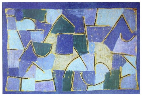In der Art eines „trompe l’oeil", scheint ein kleineres Leinwandstück, an den Ecken gedehnt und dabei leicht verzogen auf einen dunkel eingefärbten Bildträger aufgespannt zu sein. Die Bildfläche ist in unregelmäßige Felder aufgeteilt. Die Farben sind Blauvariationen von einem hellen Himmelblau bis zu gesättigten dunklen Tönungen. Wo das Blau halbdeckend über ein Rot gelegt ist, ergeben sich Violettöne; auch sie erscheinen in einer ganzen Reihe von Abtönungen. Aus der Felderreihung herausgehoben und betont sind sechs Felder in einer dunklen blaugrünen Farbe. Das Linienspiel führt das Auge in dieser Farblandschaft von einem Feld zum anderen, zum Sehen bestimmt ist dieses Bild. |