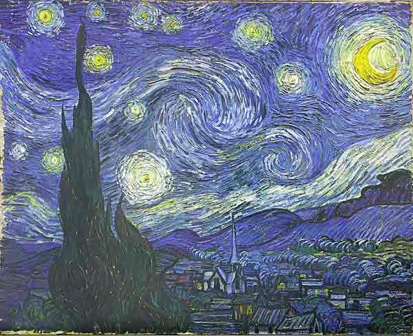 Van Goghs Bilder sind vor allem in seinen letzten Jahren bewegte Zeichen seiner aufgewühlten Psyche. Er malt sine Leinwände schnell und heftig, nichts wird verfeinert, der Gestus seiner Malweise lässt und die Bewegung ahnen, in der sich der Künstler befunden hat. |