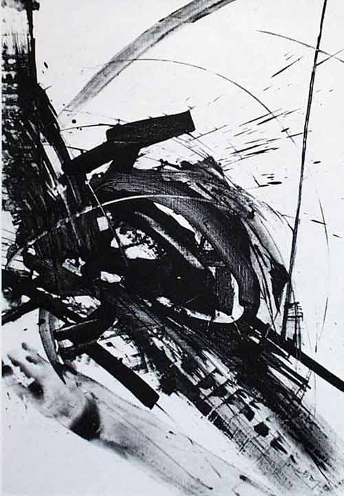 Der große Meister des Informel pflügt fast mit seinen Bildspuren die Leinwand oder die Papierfläche um, konzentriert und doch explosiv setzt der seine raumgreifenden ausdrucksstarken Pinselführungen. |