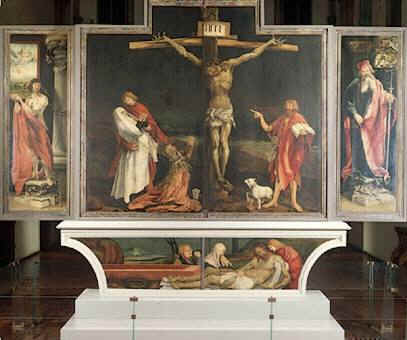 Um 1512 begann Matthias Grünewald im Auftrag des Antoniterklosters in Isenheim (Elsass) mit den Arbeiten am Altar. Die Werktagsseite des Altars zeigt im Mittelteil die Kreuzigung Christi, flankiert von den Pestheiligen Antonius und Sebastian; auf der Predella ist die Beweinung Christi dargestellt. |