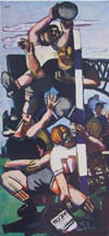 Hier sehen wir eine kunstvolle Verflechtung von Bildwirklichkeit (O''), Motiv (O) und Wahrnehmung (O' bzw. O'''). Das Motiv wird über den Titel als ein zeitlich zu erfassendes Thema dargestellt, die Rezeptionsleistung macht aus dem an und für sich statischen Bild eine zeitliche Abfolge, auch weil man sich dem motivlich vorgegebenen Thema unterordnet. Man macht aus dem Bild Bewegungsphasen, die ein "nacheinander" symbolisieren sollen. Durch das hin und her Wandern des Blicks entsteht auch so etwas wie eine Bewegung, diese ist aber erst in unserer Vorstellung vorhanden. Das Bild selbst besteht aus rhythmisch sich verändernden Richtungen von Linien und Flächenkomplexen, die auf Grund ihrer Ähnlichkeit ein "aus sich heraus sich Entwickelndes" darstellen. Im trivialen Bildbereich kennen wir das Prinzip von den "vorher-nachher" Bildern.