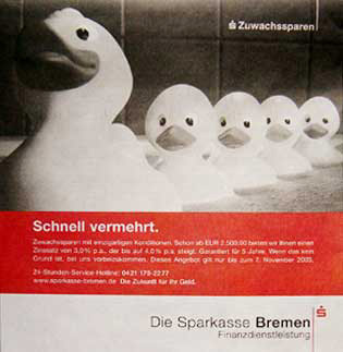 Visuell angedacht ist, das sich die Familie mindestens verdoppelt (zwei Eltern vier Nachkommen) wo natürlich bei drei oder vier Prozent Zins keine Rede von sein kann. Eher sollen wohl die vier Plastikküken die vier Prozent symbolisieren, was natürlich auch wieder eine ungeheure Lüge ist.